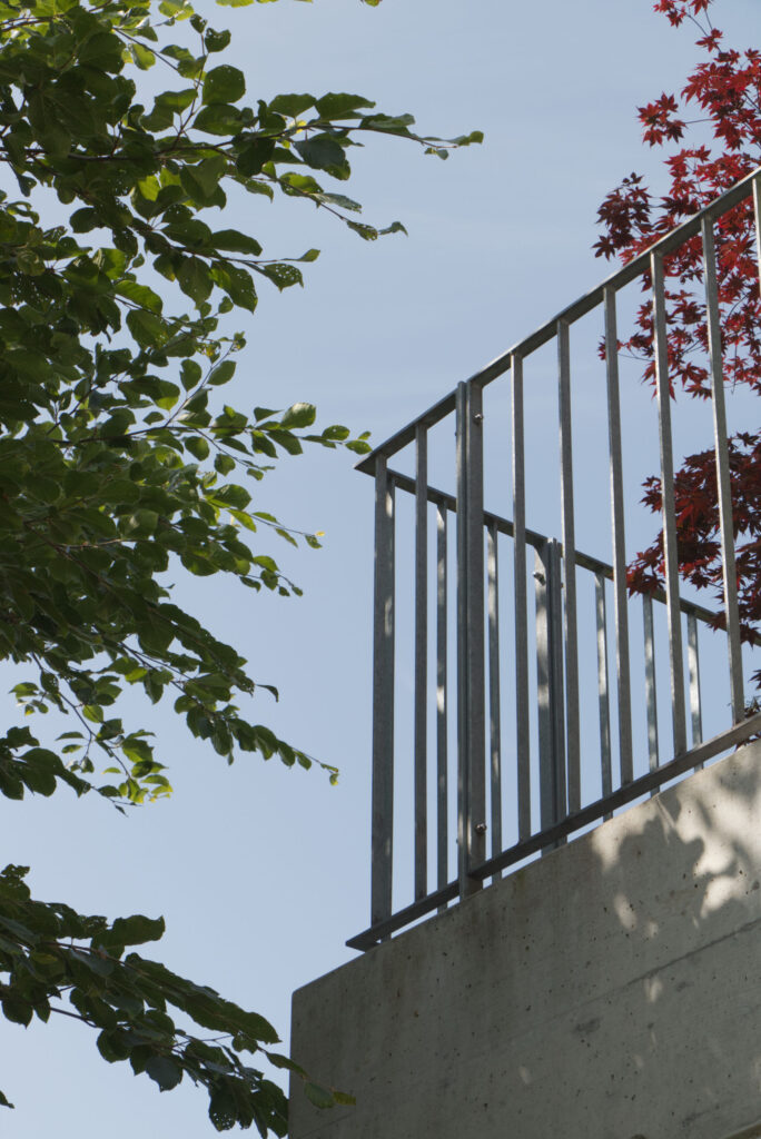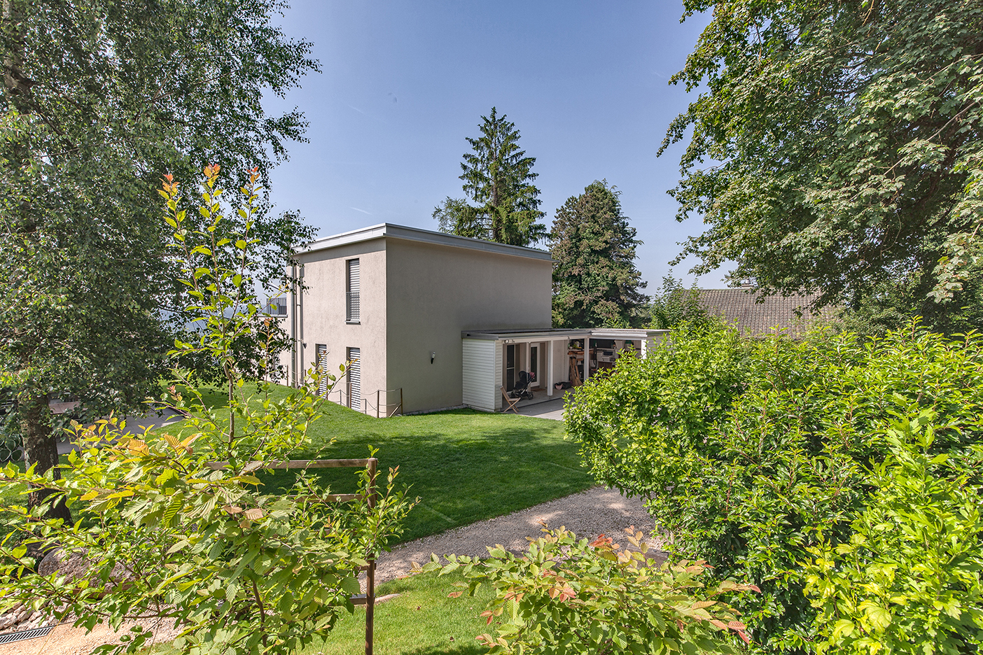Die sehr steile Hanglage bot die Möglichkeit, den Neubau als dreigeschossigen Körper zu konzipieren, deren unterster Stock sich in den Hang legt und somit eine grosszügige Wohnung auf einer Ebene ermöglicht. Die Decke dieser neuen untersten Wohnung bildet für die obere Wohnung und für das bestehende elterliche Haus die grosszügige neue Terrasse und eine grüne Wiese.