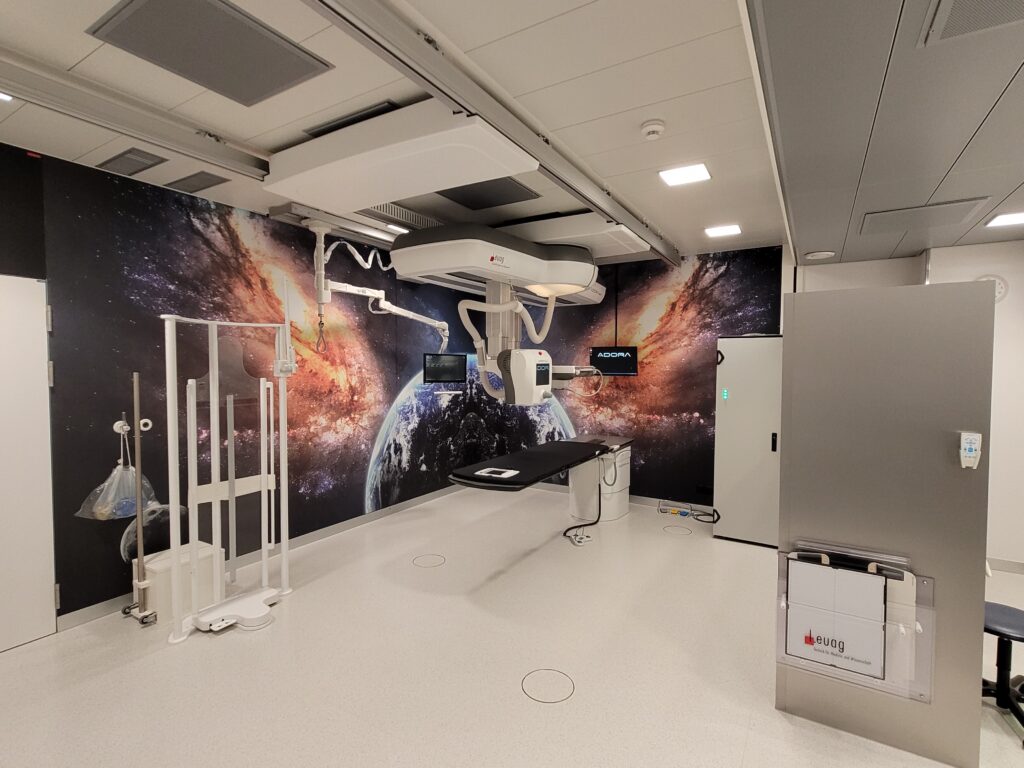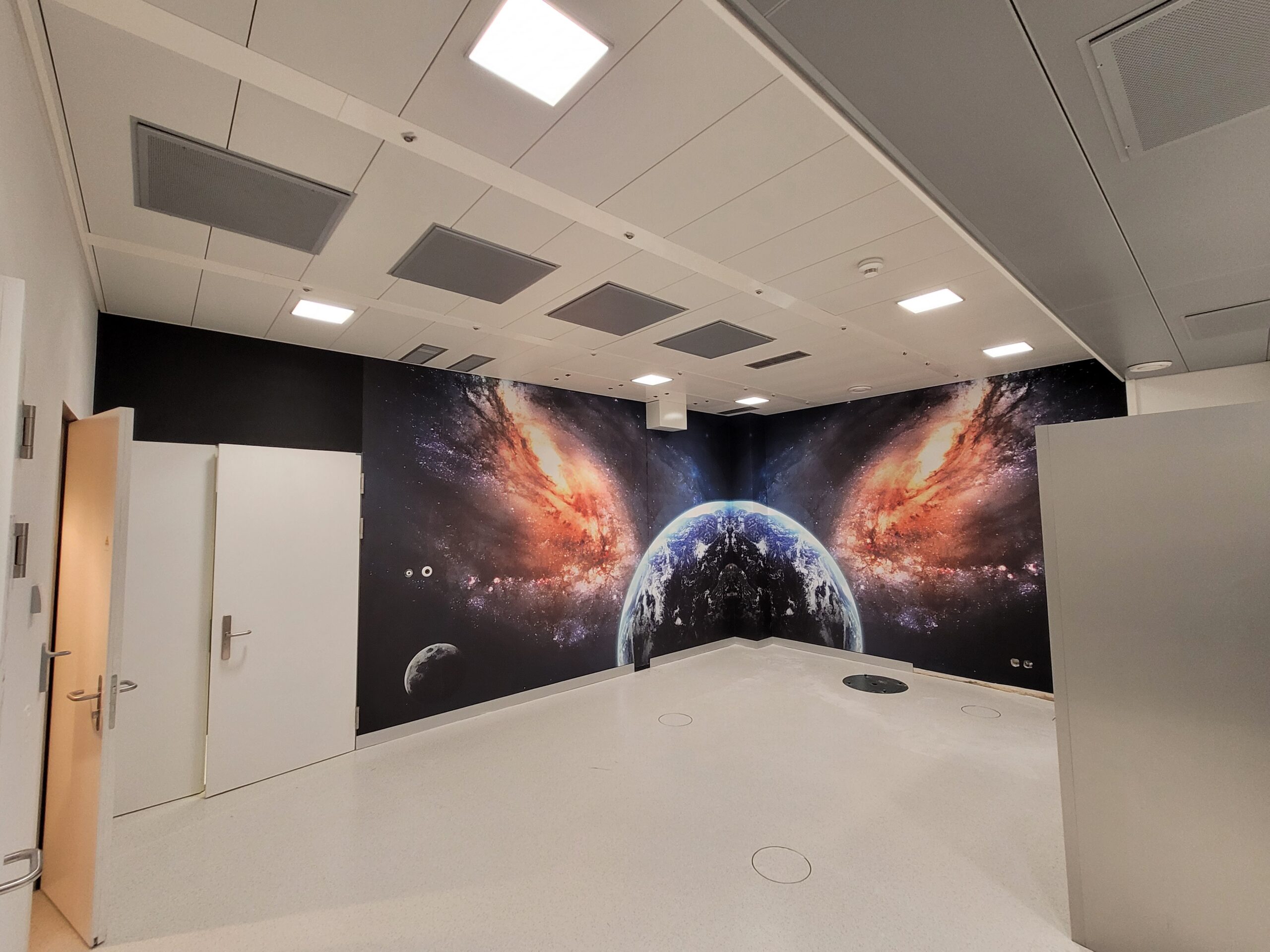 Das grossflächige Weltraumbild schafft eine faszinierende und zugleich beruhigende Atmosphäre und greift dabei die technische Komponente auf, die die Ausstattung eines Röntgenraumes mit sich bringt und überführt sie in die Weltraumtechnik.
