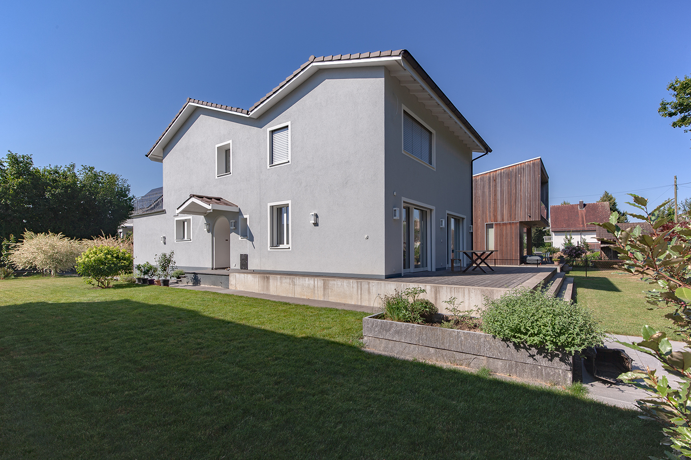 Beim Umbau eines EFH wurde die Erweiterung als «Zwilling» realisiert. Das bestehende Haus wurde mit einem Anbau erweitert, der als gespiegelte Situation ein neues Gebäude entstehen lässt. Innen und aussen vollständig saniert, ist das Alte nur noch Erinnerung.